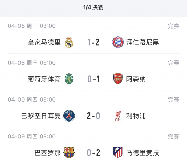 4月9日讯 欧冠1/4决赛首回合结束,巴萨0-2不敌马竞,巴黎2-0利物浦,拜仁2-1皇马,阿森纳1-0葡萄牙体育。